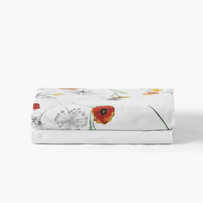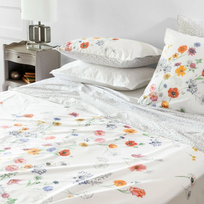 Courez librement au milieu des fleurs des champs avec la collection Eloges ! Offrant un décor romantique, ce drap de lit en percale de coton illustre une magnifique envolée de fleurs colorées. Il présente également un parement avec un micro-motif de petites fleurs plus discrètes, animé par un élégant passepoil argenté. Complétez votre drap de lit avec les autres éléments de la parure Eloges pour créer une ambiance résolument bucolique.