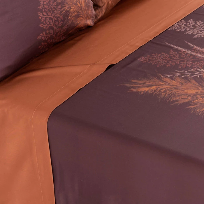 | Motif | Motif placé imprimé d'herbes de pampa et de graminés sur fond pourpre – Parement uni coloris cuivre |