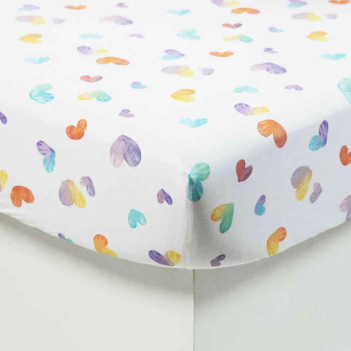 Ce drap housse enfant revêt un imprimé aquarellé de coquillages en forme de coeurs.