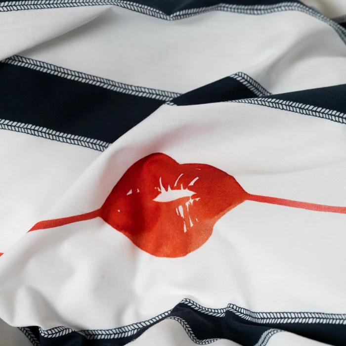 | Motif | Une face motif placé de rayures marines entre lesquelles est placée une bouche aquarellée – Unie face unie blanche |