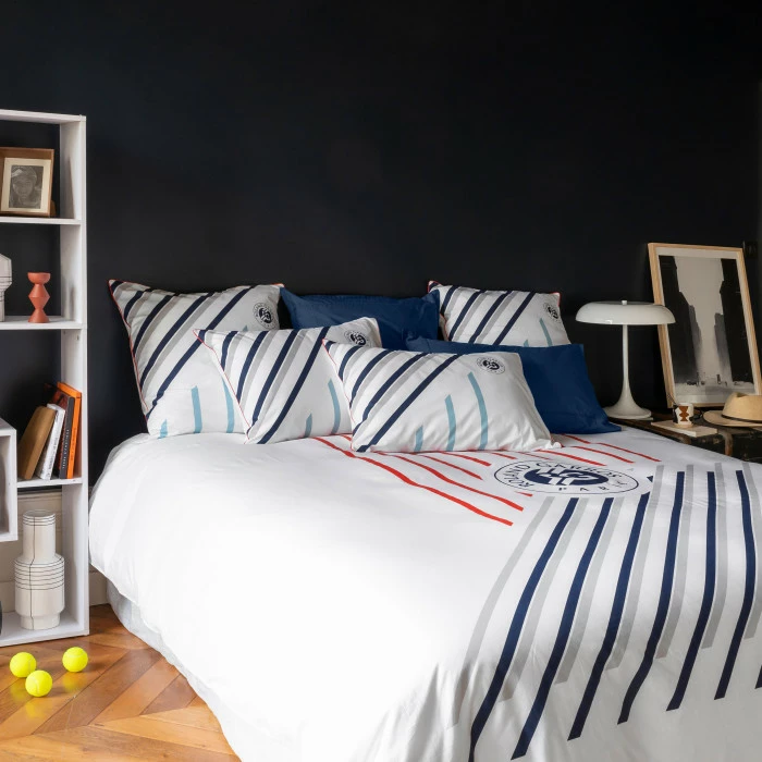 Vivez une expérience graphique aux couleurs du tournoi Roland-Garros avec la housse de couette Tie Break. Confectionnée en percale de coton, cette collection met en scène un jeu de lignes inspirées de l’architecture des couloirs du stade, arpentés par les plus grandes légendes du tennis. Affichant un logo Roland-Garros brodé en son coeur, cette collection hommage porte haut les valeurs du sport. Elle séduira toutes les générations !