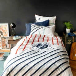 Ce linge de lit affiche une combinaison de lignes graphiques aux couleurs du tournoi.