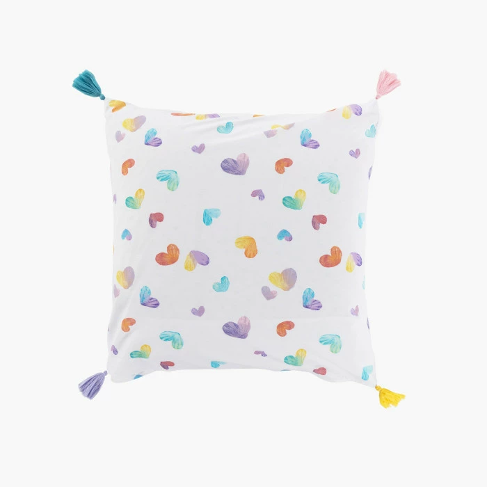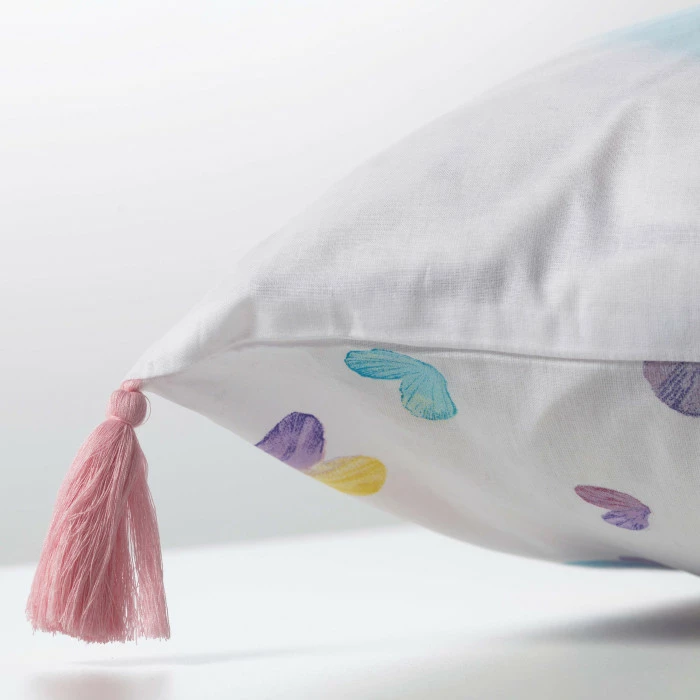 Cette taie d’oreiller arbore des pompons multicolores pour une touche de fantaisie.