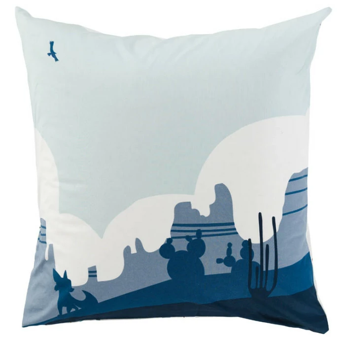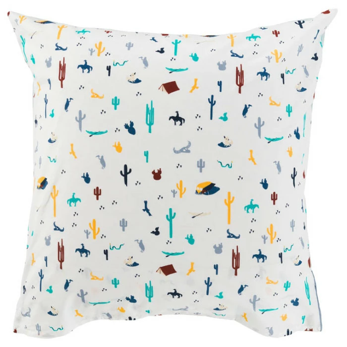 Sur son recto, la taie d’oreiller carré West s’orne d’un paysage typique du Far West dans un élégant dégradé de bleus et un jeu d’ombres pensé avec beaucoup de modernité. Ce camaïeu de bleus forme un ensemble tonique associé à un décor propice à l’imaginaire. Le verso de la taie s’habille d’une multitude de petits cactus et animaux colorés typiques de l’Ouest américain sur un éclatant fond blanc. Le résultat : un imprimé all-over ludique et à l’esthétique travaillée, idéal pour passer de la décoration d’une chambre d’enfant à celle d’un jeune adolescent.