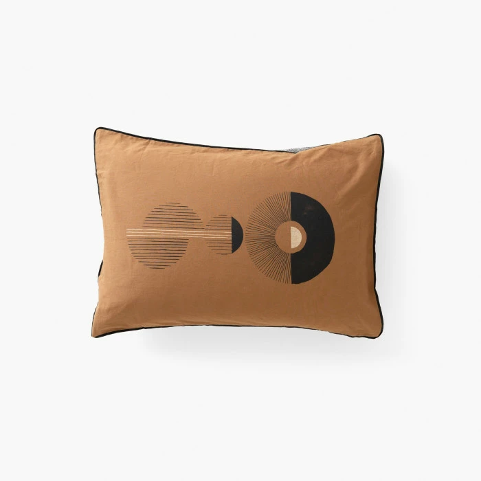 Les adeptes de la décoration bohème vont adorer la taie d’oreiller Eclipse ! Une parure qui joue sur les mélanges des imprimés et le contraste entre les coloris charbon et caramel.