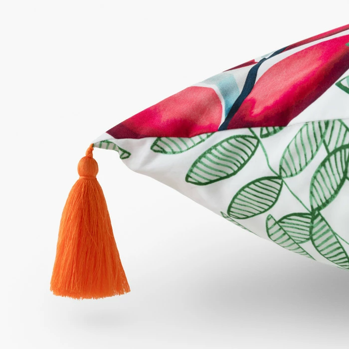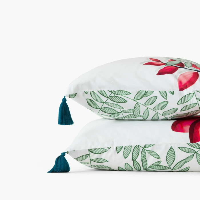Grâce à son double décor inspiré des célèbres jardins de la Martinique, la collection Balata vous transporte directement sous le soleil des Antilles. Cette taie d’oreiller réversible en percale de coton dépeint une végétation haute en couleurs d’un côté et un imprimé graphique de feuilles vertes de l’autre. Laissez-vous séduire par ses jolis pompons colorés pour habiller votre chambre au printemps-été !