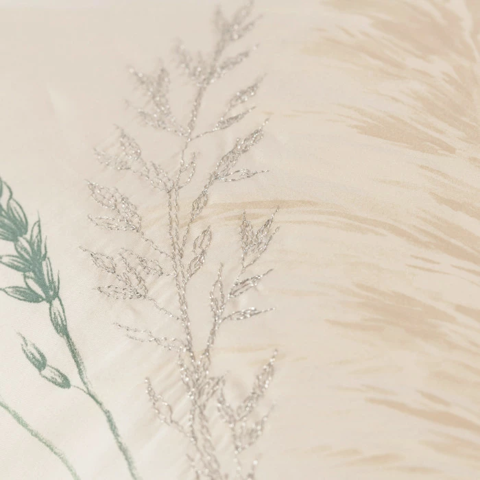 Notre collection Pampa se réinvente cette saison dans des coloris beige et vert pour sublimer votre chambre à coucher. Véritable prouesse de savoir-faire et de créativité, cette taie d’oreiller propose une impression placée de bouquet de graminées, mariée à des broderies métalliques argentées et tilleuls. Réversible, elle dispose également d’un fond uni pour vous permettre de créer des mix and matchs.